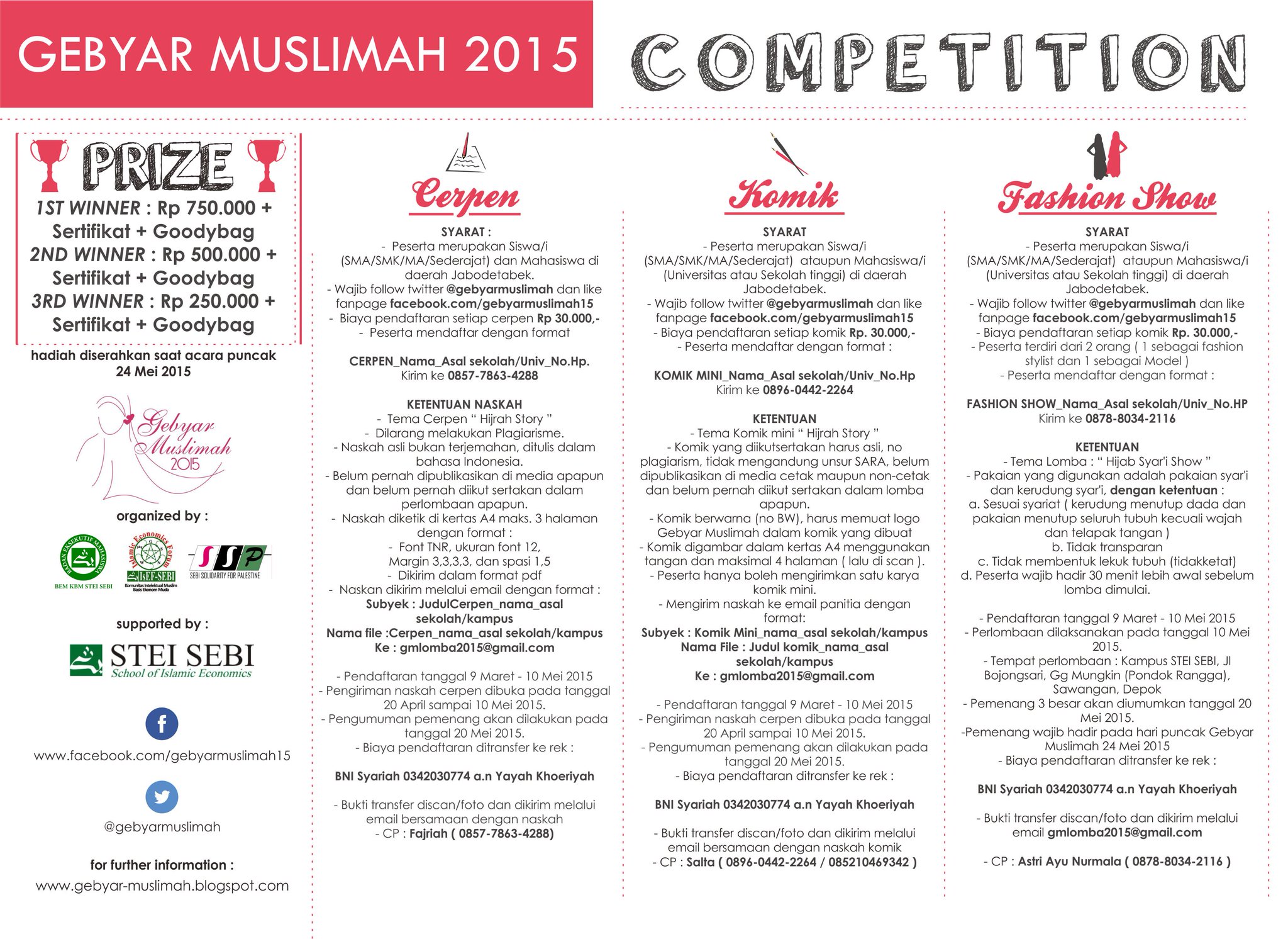 ~ Hadiah untuk juara I - III akan diserahkan pada Acara Puncak Gebyar Muslimah 2015 pada hari Minggu, 31 Mei 2015 di STEI SEBI, Sawangan - Depok.